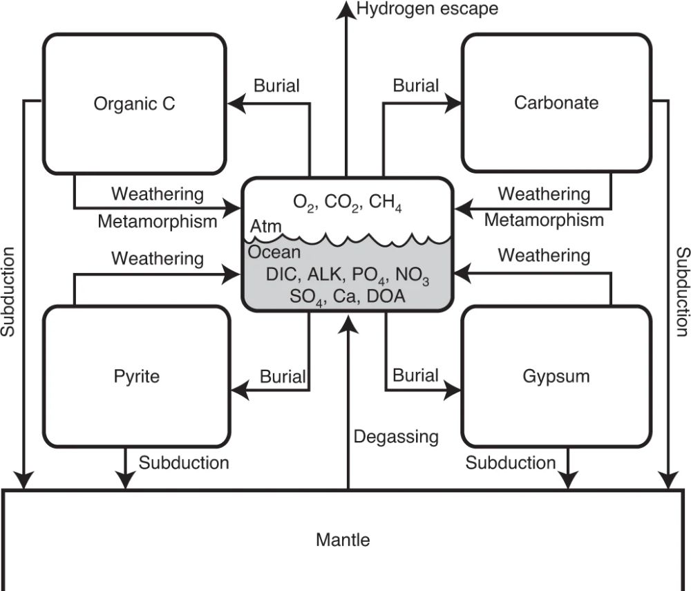 图1 模型结构示意图(Ozaki and Reinhard, 2021)。示意储库(方框)之间C、S、O和P的转移通量,涉及海洋生物地球化学和地壳-海洋-大气系统与地幔之间长期的迁移和交换。Atm,大气;DIC,溶解的无机碳;ALK,碱度;DOA,缺氧程度