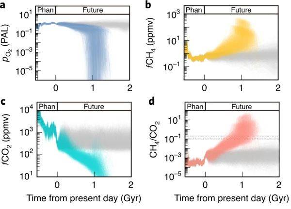 Ozaki和Reinhard采用了概率的随机抽样方法,对主要地球物理边界条件的参数随机抽取各种可能的值,包括去气速率和侵蚀条件的变化(周期和幅度),并设600 Myr年前起始(即t=0)。反复取值,时间不断增加,直到今天(n=~400 000)。对模型做二次抽样运行(n=4787),得到大致重现的现代大气组成、全球平均表面温度(286 K<Ts <290 K)和海水硫酸盐(SO42-)含量(10 mM <SO42– <40 mM),采用现代大气O2(20%<fO2<22%)和CO2(150 ppmv<fCO2<450 ppmv)的混合比。通过二次抽样模拟,将时间推向未来去估计地球上氧化的大气将来可使用的年限。