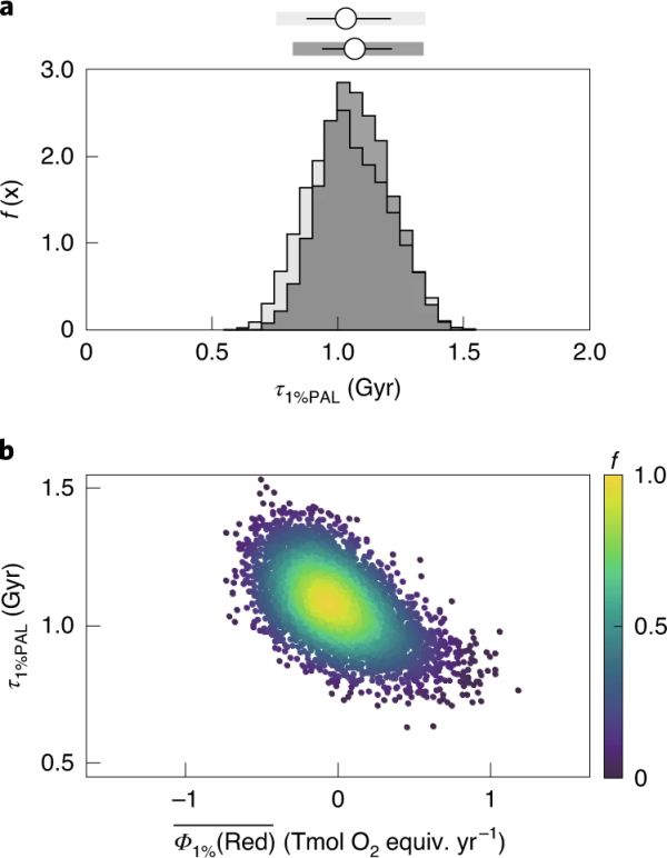图3 地球氧化大气未来的寿命(Ozaki and Reinhard, 2021)。(a)默认有陆地生物圈(深灰色)和没有陆地生物圈陆地生物圈(浅灰色)后段的几率密度分布,空心圆表示中值,误差线为1σ,而阴影表现95%置信度的区域;(b)τ1%PAL作为Φ1%(Red) 的函数。Φ1%(Red)的正值表现由地幔到地表系统的还原力(reducing power)净输入(详见原文方法)。每个点是一次模型运算,色标表示相对的数据密度。模拟过程中有少量运行(占~4%)中大气O2水平达不到1%PAL