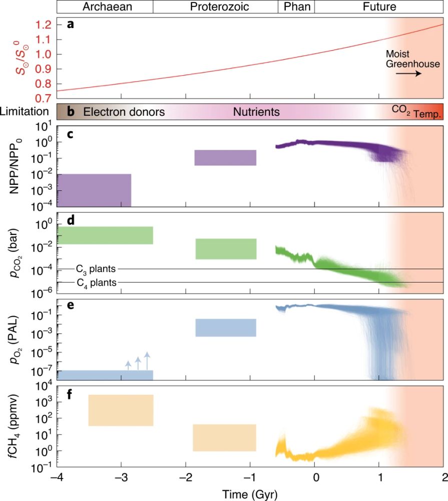 造成地球未来大气O2长期减少最明显的因素是太阳变亮,这造成陆地上光合生物圈中大气CO2“饥饿”和地表温度升高(图2c)。假定太阳光度恒定,运行模式确实没有长期的O2下降趋势(图2a)。未来太阳变亮和地幔变冷,驱使地球上大气中CO2减少是无可争议的,因此所预测大气O2轨迹的一级特征是可靠的。