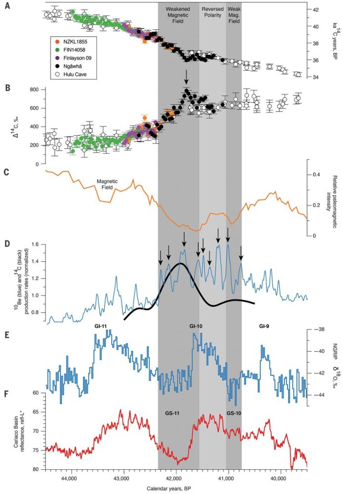 近日,南澳大利亚博物馆的Alan Cooper等人针对拉尚漂移开展了年代学以及与环境变化的关联性研究。利用新西兰生长于42 ka前具有1700年年轮的贝壳杉(Kauri Tree)古树中记录的14C变化信息,结合气候模型模拟结果,将地磁场倒转与大规模的环境变化联系起来,认为在42-41 ka之间,地磁极发生了短暂的倒转,并引发地球一系列的环境危机,并可能对当时澳大利亚的大型哺乳动物的灭绝,尼安德特人从欧洲的消失与智人占据统治地位,欧洲和亚洲开始出现洞穴壁画等产生了影响。