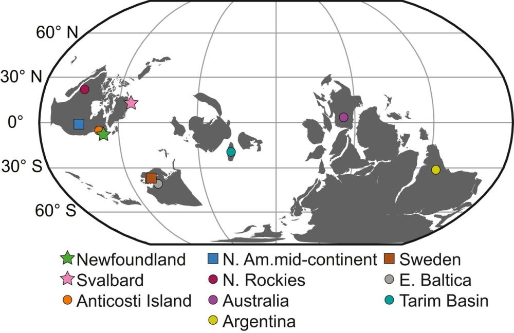 最近,美国麻省理工大学的Goldberg博士和合作者为了弥补化石材料缺失的不足,对全球7个地区(多数在热带,见图1)的寒武纪-奥陶纪碳酸盐岩台地剖面中沉积物全岩稳定同位素进行系统地分析、收集和集成研究,建立了全球首条高分辨率早古生代海洋δ18O曲线,相关成果发表于PNAS。