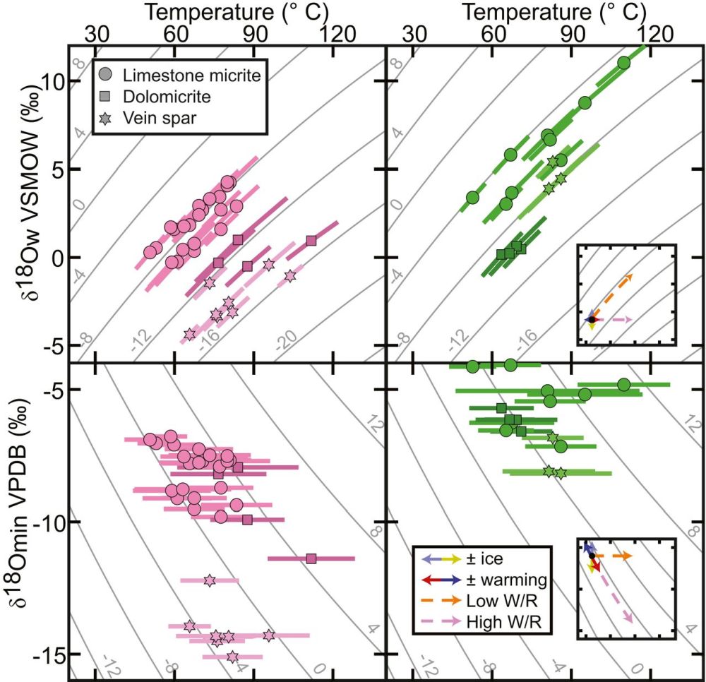 图2 来自斯瓦尔巴群岛(左)和纽芬兰岛(右)样品的团簇同位素温度、碳酸盐矿物δ18O和流体δ18O之间的对比。插图显示地表条件(实线)和成岩作用方式(虚线)的理论变化轨迹。各图中灰色线条表示方解石平衡分馏变量的等值线。W/R为水/岩比值(Goldberg et al., 2021)
