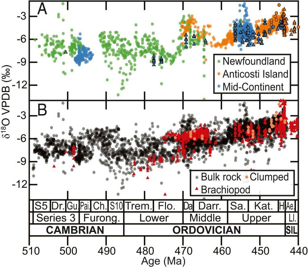验证构造、气候和生物演化相互作用的假说需要可靠的记录。化石提供了早显生宙以来丰富的海洋生物多样性记录,构造变动历史也能通过多维地质证据得到重建。然而,早古生代气候变化却缺乏很好的约束,主要是因为:一、传统氧同位素(δ18O)温度计重建古温度有很大不确定性(因为缺少独立的海水氧同位素数据);二、寒武纪和早奥陶世沉积岩中缺乏保存完好的海洋生物(如腕足类和牙形石)壳体化石(即重建古气候的理想载体)。