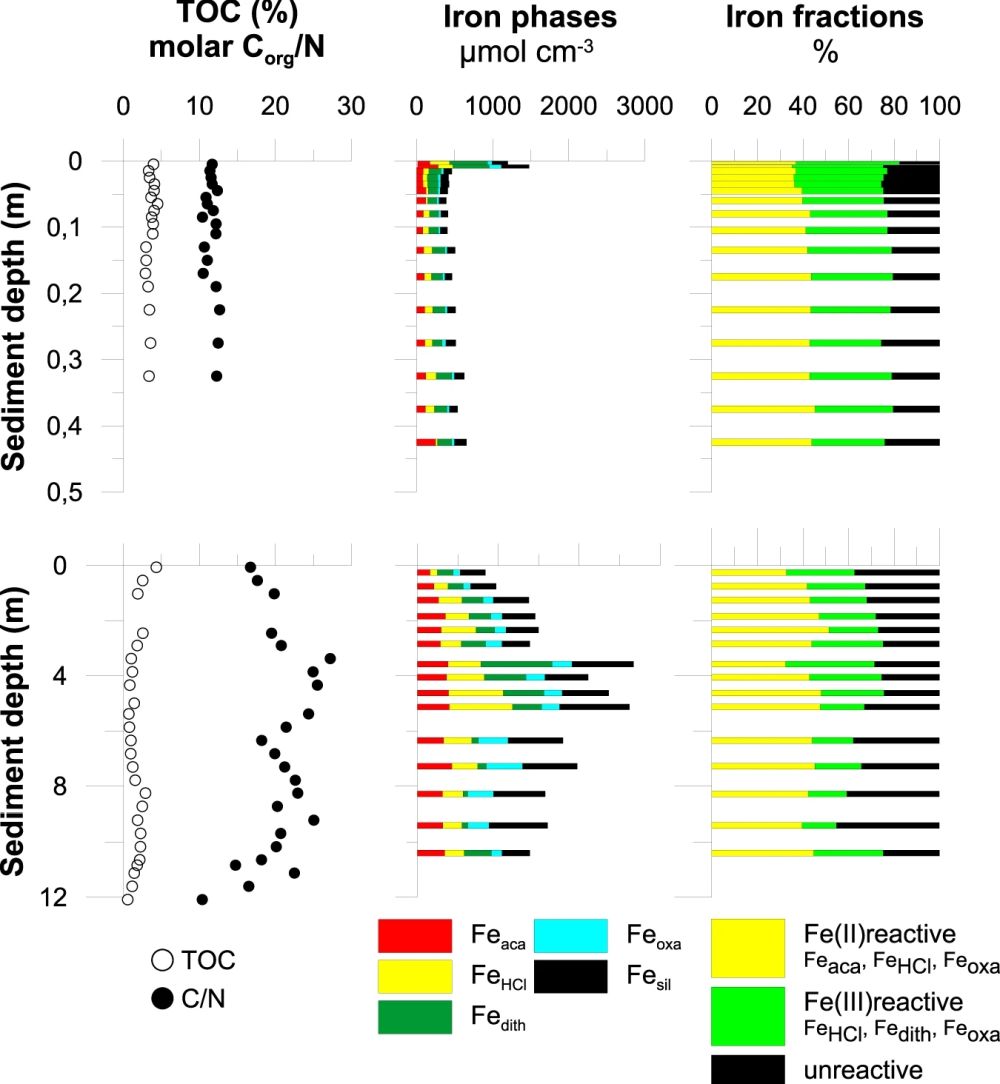 图1 Towuti湖中钻孔上部12米的沉积物特征(Friese et al., 2021)。重力柱(< 0.4 m)(上)和钻孔(12m)(下)沉积物的有机质总含量和有机碳与氮(Corg/N)的摩尔比(左列)、逐步提取的铁组分(中部)以及各种铁组分所占的比例(右列)。值得注意的是,由于FeHCl中三价铁含量低于检测限,因而可供反应的三价铁由Fedith和Feoxa两部分组成