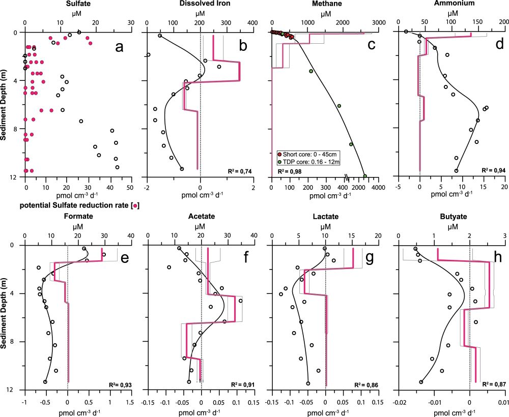 图2 孔隙水的化学特征和有机质矿化中涉及到的反应物的通量(Friese et al., 2021)。空心圆圈代表沉积物孔隙水的化学组成。黑色线代表拟合的浓度剖面,其中R2为拟合线的相关系数。橙色的实体线代表平均反应速率剖面,灰色线代表该剖面的标准差。顶部x轴代表含量,底部x轴代表反应速率。正值为净生产值;负值为各个化合物的净消耗值。a图中红色圆圈代表的每个硫酸盐的还原速率通过放射性示踪发酵实验测定。硫酸盐(a)和三价铁(b)的还原速率明显小于甲烷产生的速率(c)。铵基(d)和不同的挥发性脂肪酸(e-h)的净生产值说明有足量的沉积有机质促进异化的微生物活动