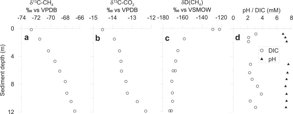 图3 Towuti湖沉积物中孔隙水溶解的甲烷和二氧化碳的碳同位素组成以及孔隙水的酸碱度(pH)值和无机碳的含量(Friese et al., 2021)。(a)甲烷的碳同位素组成;(b)二氧化碳的碳同位素组成;(c)甲烷的氘组成;(d)孔隙水pH值和无机碳含量