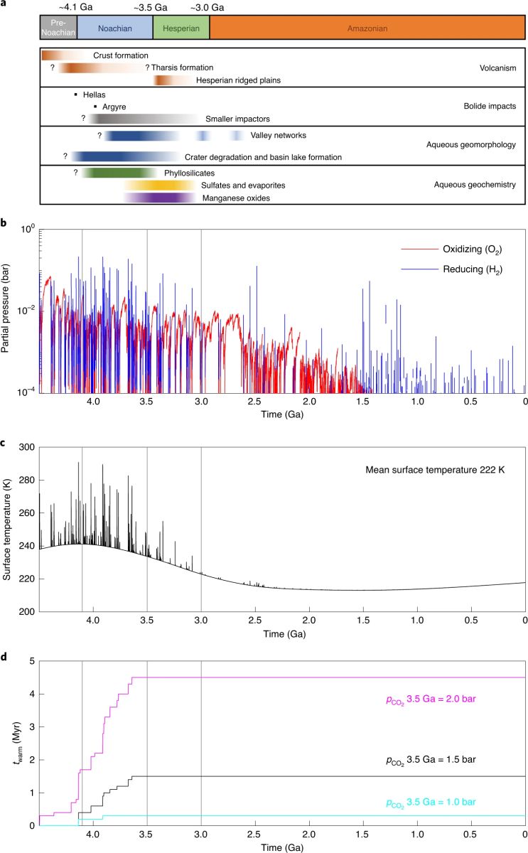 Wordsworth et al.(2021)为了能够同时解释火星大气的温度、氧化还原性和地质地球化学等观测,建立了一个描述火星大气演化的耦合模式。该模式包含了由于陨石撞击、火山和地质活动带来的还原性温室气体的释放、由于太空逃逸造成的H2和O2的逃逸,以及CO2、水蒸气和还原性气体的温室效应。作者假设还原性气体的释放率为幂律分布。由于分布函数的平均值和变化率这两个参数不确定,他们采用了大量随机性参数的模拟测试,得到了一系列结果后,再排除掉那些不现实的结果。图2为该模式中一个较符合观测的模拟结果,由图可以看出该模式模拟出的结果为:火星大气总体为还原性、干冷气候,在火星早期(诺亚纪和西方纪)发生了多次间歇性的氧化性、温湿气候(图2b、图2c)。从图2c可以看出火星气温总体上是远远低于水溶点0℃(273K)的,但气温达到0℃以上单个事件多次发生,每次持续的时间都较短暂。图2d估算出在不同CO2大气压下,气温达到0℃以上的具体持续时间可达到几个百万年,这与地貌化学观测结果基本相符,即:用河谷网等地貌规模推测出的河流持续时间在几万到几千万年,用火星地表碳酸盐较少等地球化学特征推测地表液态水持续时间少于几百万年。另外该模式模拟出的气温和氧化还原过程(H2的逃逸等)也能较好的解释火星快车的观测:即火星早期诺亚纪(36亿年前)主要为在湿润还原性环境下产生的黏土矿物,到西方纪(36-32亿年)则以硫酸盐为主。同时该模式的结果也指出由于火星长期干冷、短期间接性温湿气候,对生命长期在火星生存提出了挑战。