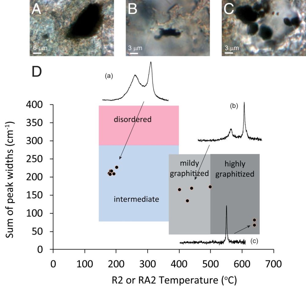拉曼光谱学是一项非破坏性分析技术,可以依据分子振动能量状态来测定热成熟有机质的结构有序度。生物分子在成岩和低变质作用过程中逐渐受热裂解(H, O和其它杂原子的丢失)及芳构化,形成无序的宏观分子干酪根,后期变质作用产生物理性的分子定向排列和石墨化(Vandenbroucke & Largeau, 2007)。在初始分析时,Canfield et al.(2021)从每个地层单元里挑选了几个样品获得其中有机质的拉曼光谱,通过矫正拉曼光谱地温计来估算有机质的热成熟温度。对于大多数样品来说,使用Lahfid 和 Kouketsu 地温计即可,而对于高成熟度的样品则要使用Beyssac 地温计。Canfield et al.(2021)从Lahfid 地温计中进行了峰宽汇总,在Sparkes 图解上指定了分析结果所对应的热成熟度区域。