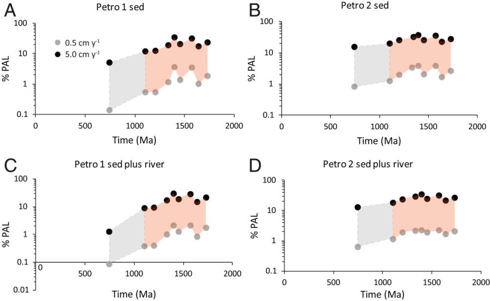 通过估算岩相碳的最大含量,Canfield et al.(2021)用这些模拟结果计算出了最低大气氧含量,计算时既用到了最低抬升速率(0.5 cm/ky)又用到了最高抬升速率(5 cm/ky)(图3)。在不考虑河流氧化的情况下,根据Petro-1类型的样品估算的最低大气氧含量介于1%-3.5% PAL和12%-35% PAL之间(图3A);而对于Petro-2类型的样品,由此估算的最低大气氧含量介于2%-4% PAL和21%-39% PAL之间(图3B)。如果考虑700 km长的河流氧化,根据Petro-1类型样品估算的最低大气氧含量值减小至0.4%-2% PAL和9%-30% PAL之间(图3C),而对于Petro-2类型样品,由此估算的最低大气氧含量值减小至1%-2% PAL和18%-35% PAL之间(图3D)。总体来讲,用最低抬升速率(0.5 cm/ky)估算的1729-1100 Ma期间单个地层组沉积期的最低大气氧含量为0.4%-4% PAL,而用最高抬升速率(5 cm/ky)估算的单个地层组沉积期的最低大气氧含量为9%-35% PAL。