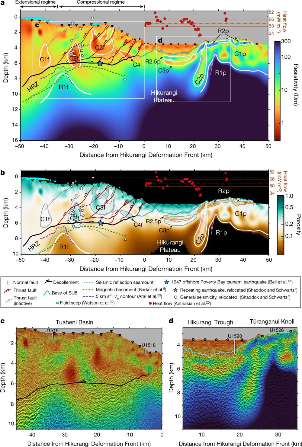位于新西兰北岛东海岸的Hikurangi陆缘,是西南太平洋板块向澳大利亚板块汇聚的俯冲带。Hikurangi陆缘北段频繁发生浅部慢地震事件,且毗邻的太平洋海底分布着许多大型海山。特别是,前人地球物理观测已揭示出在该俯冲带弧前深部,正发生着海山俯冲(图1b和图2a;Arai et al., 2020; Barker et al., 2018)。近期,美国哥伦比亚大学的Chesley及合作者基于横跨Hikurangi陆缘北段的海底电磁探测剖面(图1),采用被动源+可控源电磁数据联合反演构建了研究区深部高分辨率电阻率图像(图2a),并利用洋壳电阻率对孔隙度敏感的特性,进一步估算了沿剖面孔隙度(含水量)分布(图2b)。通过剖面上未俯冲、已俯冲海山之间的电性结构特征对比,为揭示海山的俯冲效应提供了绝佳的研究思路与可靠约束。相关成果于2021年7月7日发表于Nature(Chesley et al., 2021)。