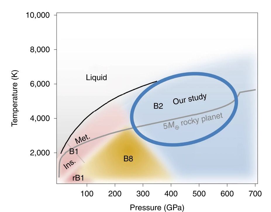 在过去数十年里,数以千计的系外行星被发现,其中包括许多比地球体积更大、内部温度压力更高的岩质系外行星。目前,大多数描述这些岩质系外行星内部成分的模型都是基于地球分层结构的缩放版本,即由硅酸盐为主的幔包围着铁核。虽然这些模型便于我们理解岩质系外行星的内部结构和组成,却忽略了大型岩质系外行星(比地球体积或质量大)中极端温度和压力条件所造成的物质属性变化。例如,Unterborn and Panero (2019)认为,即便岩质系外行星的半径很可能被限制在小于1.5倍地球半径之内,其最大预期的核-幔边界压力和绝热温度仍可以达到630 GPa和5000 K。这些极端高压和高温条件下系外行星内部物质的性质,实验数据仍然非常缺乏。