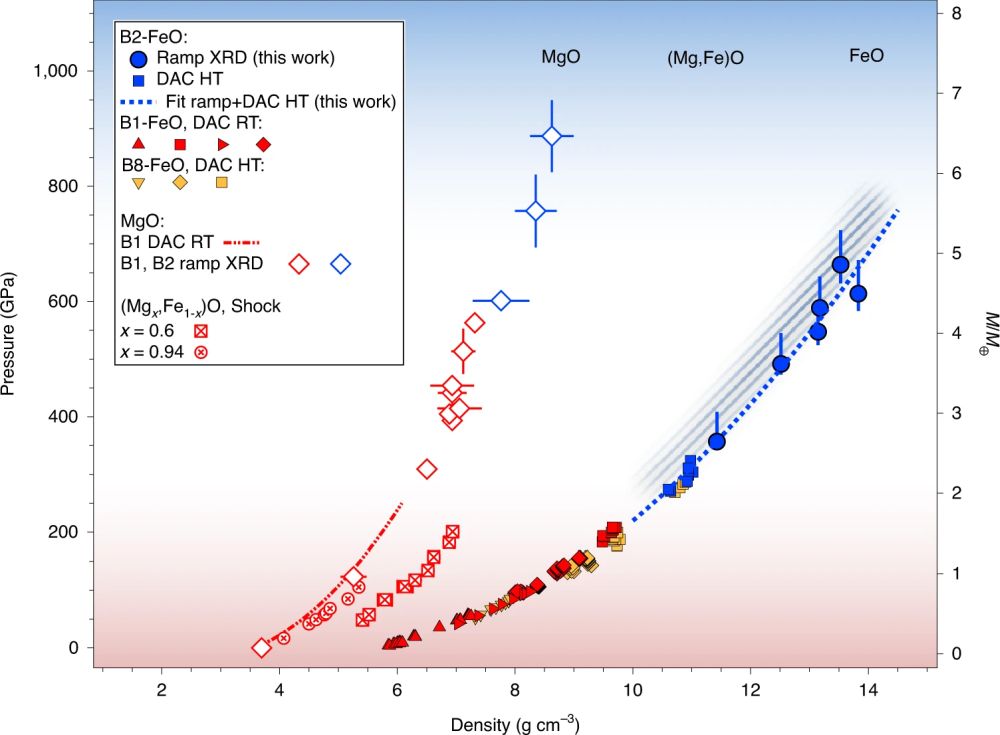 FeO的密度值(蓝色圆圈)与金刚石压腔实验得到的不同结构FeO密度值(B1:红色三角形、正方形、右三角、菱形;B8:黄色三角形、菱形、正方形;B2:蓝色正方形),阴影带表示FeO化学计量可能变化的密度范围;MgO的压力-密度关系(B1:红色点-虚线;B1/B2:红色和蓝色空心菱形);不同成分(Mg, Fe)O的压力-密度关系 (交叉圆圈和正方形)。红色和蓝色背景表示相同结构MgO和FeO的压力范围。右轴显示了岩质系外行星的不同质量尺度,左轴显示了对应质量尺度的类地行星核-幔边界的压力