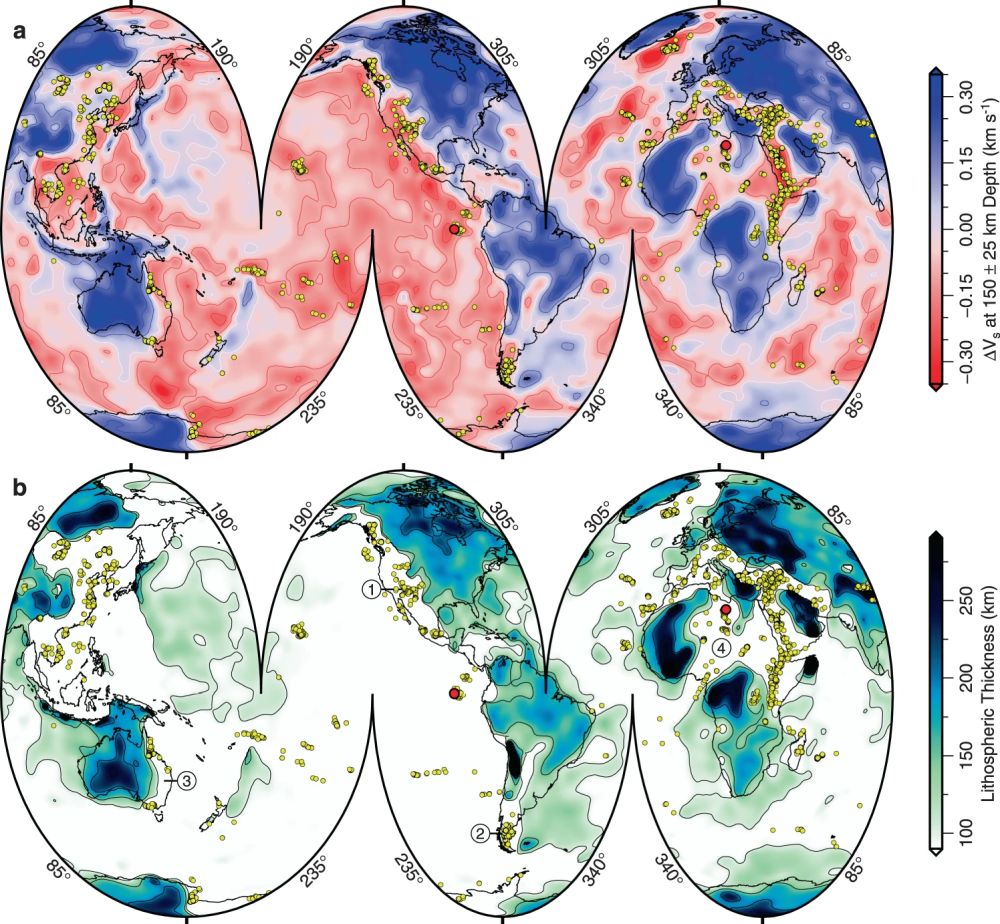 图1 新近纪-第四纪板内火山分布。(a)深度为150±25km全球剪切波速度异常平均值(ΔVs)层析成像结果来自 SL2013sv模型。黄色圆圈:年龄< 10 Ma 且喷发距离< 400 km的板内岩浆样品。(b)利用 SL2013sv 层析模型的1175 ℃ 等温面交点计算岩石圈厚度的空间变化。①②③④分别标识北美洲西部、南美洲最南部、澳大利亚东部以及北非的高海拔的平缓倾斜的晚白垩纪-新生代海相地层出露(Ball et al., 2021)