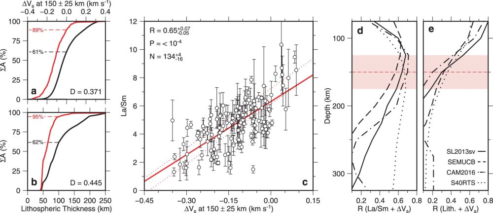 图2 空间和地球化学相关性。(a)在150 ± 25 km深处,剪切波速度负异常累积面积的百分比。其中黑曲线:全球的累积面积百分比,红曲线:火山样品分布区域中剪切波速度负异常的累积面积百分比。黑/红色虚线:Δvs < 0 km/s的全球表面和板内火山活动的百分比。(b)薄岩石圈累积面积Σa百分比。黑色/红色曲线:薄岩石圈在全球和板内火山样品分布区的累积面积百分比; 黑色/红色带数字的虚线:全球或板内火山活动区中岩石圈厚度 < 100公里的累计面积百分比;(c)La/Sm 与Δvs (150±25 km) 的相关性;(d)在不同深度La/Sm 与Δvs的相关系数的变化;(e) 在不同深度岩石圈厚度与Δvs的相关系数的变化(Ball et al., 2021)