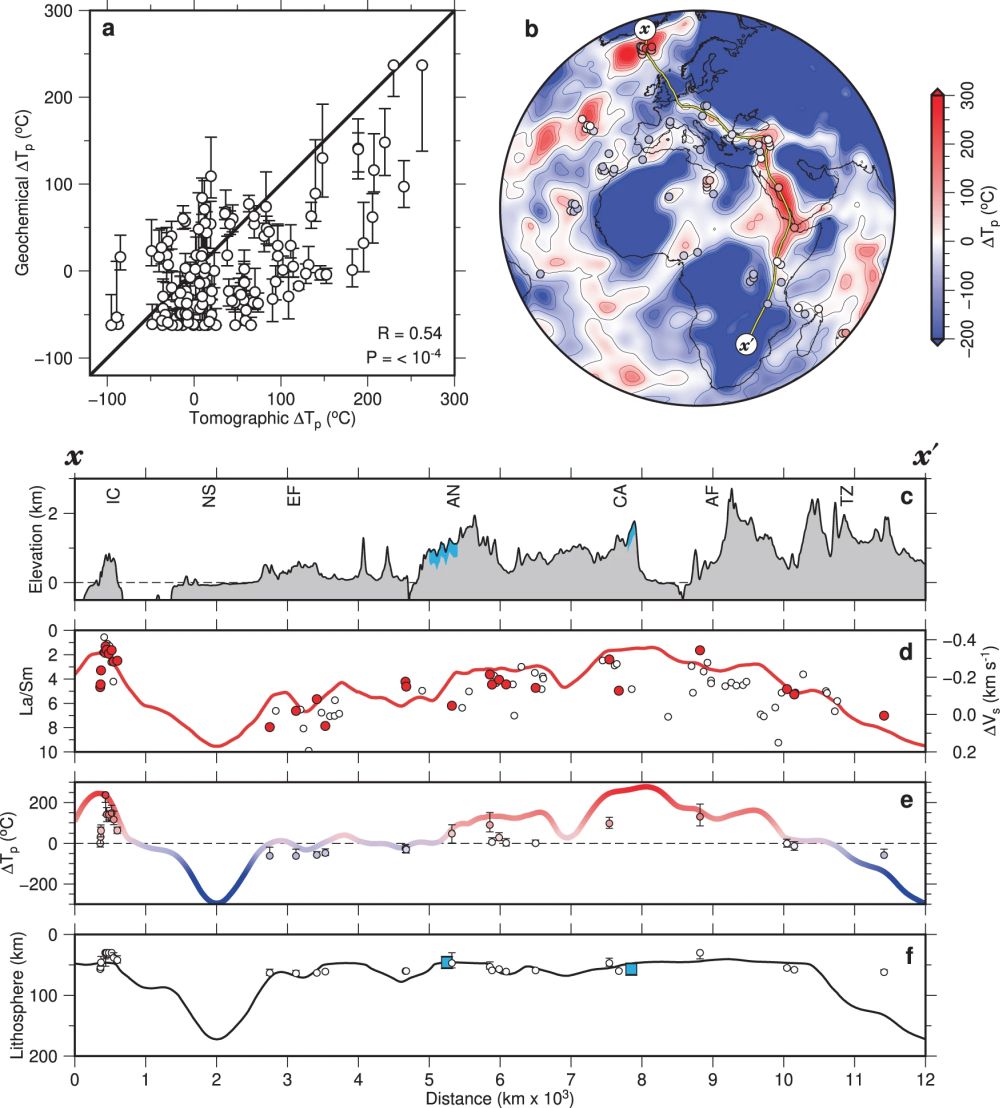 图3 计算温度变化、岩石圈厚度变化和动力学地形之间的关系。(a)分别由地球化学反演模型和SL2013sv地震层析成像模型计算的ΔTp的关系图;(b)由 SL2013sv 层析模型计算的深度为150 ± 25km 时的ΔTp平均值的空间变化图;(c)根据(b)中穿过冰岛(IC)、北海(NS)、埃菲尔(EF)、安纳托利亚(AN)、阿拉伯中部(CA)、阿法尔(AF)和坦桑尼亚(TZ)的横切面x-x’绘制的海拔图,蓝色多边形为隆升的新生代海洋地层,(d)、(e)和(f)都沿x-x’绘制;(d)红色曲线:SL2013sv 层析成像模型计算的150 ± 25km 深处Δvs 的平均值,白圈:平均分布在距离剖面小于200 km的1°范围平均的La/Sm观测值,红圈:样本数>5的La/Sm值;(e)彩条:根据 SL2013sv 层析模型计算出150 ± 25km深度的ΔTp 平均值。(f)黑线:SL2013sv层析模型计算的岩石圈厚度沿x-x’的变化,带数条的圆圈:地球化学模拟确定的岩石圈厚度±1.5倍的最小失配度,蓝色方框:基于岩石圈地幔减薄和上地幔热异常,根据海相岩石的海拔估计的现今岩石圈厚度(Ball et al., 2021)
