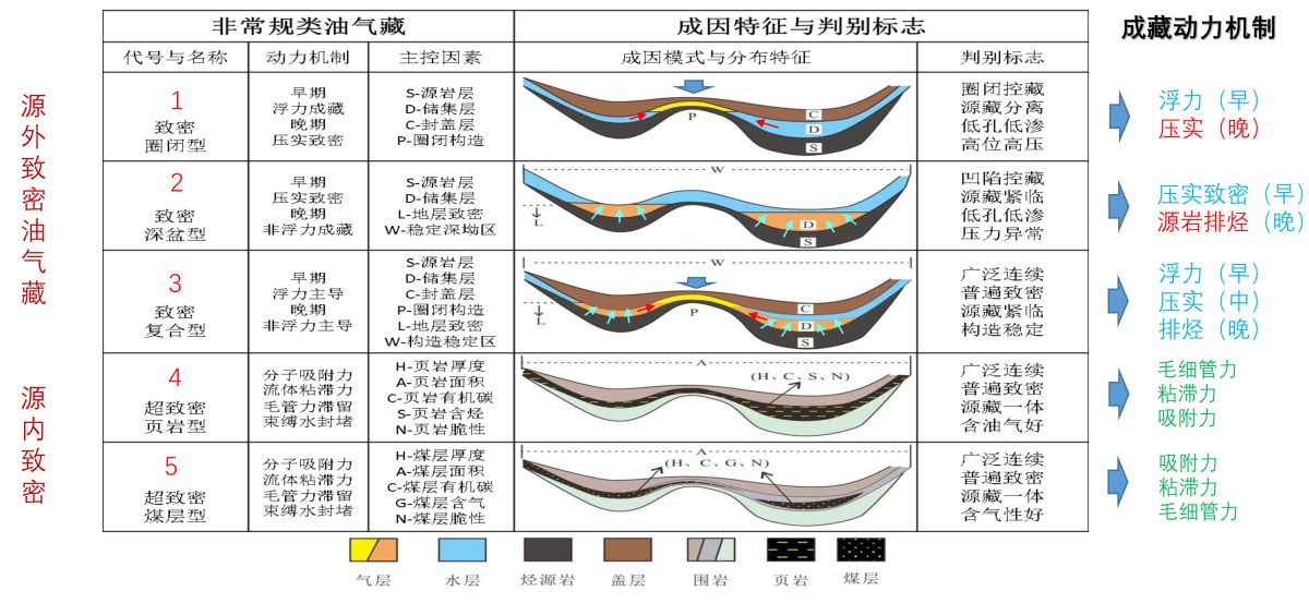 致密油气藏成因有两类五种机制(图1)。第一大类为源外致密油气藏,分为三小类,分别为致密圈闭型,成藏动力机制为早期浮力成藏,晚期压实致密;致密深盆型,早期储层压实致密,后期非浮力成藏;致密复合型,早期浮力主导成藏,晚期非浮力主导成藏。第二大类为源内致密油气藏,有两小类,包括超致密页岩型和超致密煤层型,成藏动力包括分子吸附力、流体粘滞力、毛管力滞留和束缚水封堵。