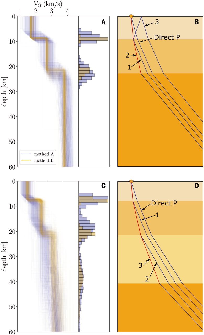 图1 利用接收函数方法获得的火星壳结构(Knapmeyer-Endrun et al., 2021)。(A)和(B)为基于两层模型参数的反演结果及主要震相的传播路径示意;(C)和(D)为基于三层模型参数的反演结果和射线路径。P波和S波传播路径分别用黑线和红线表示