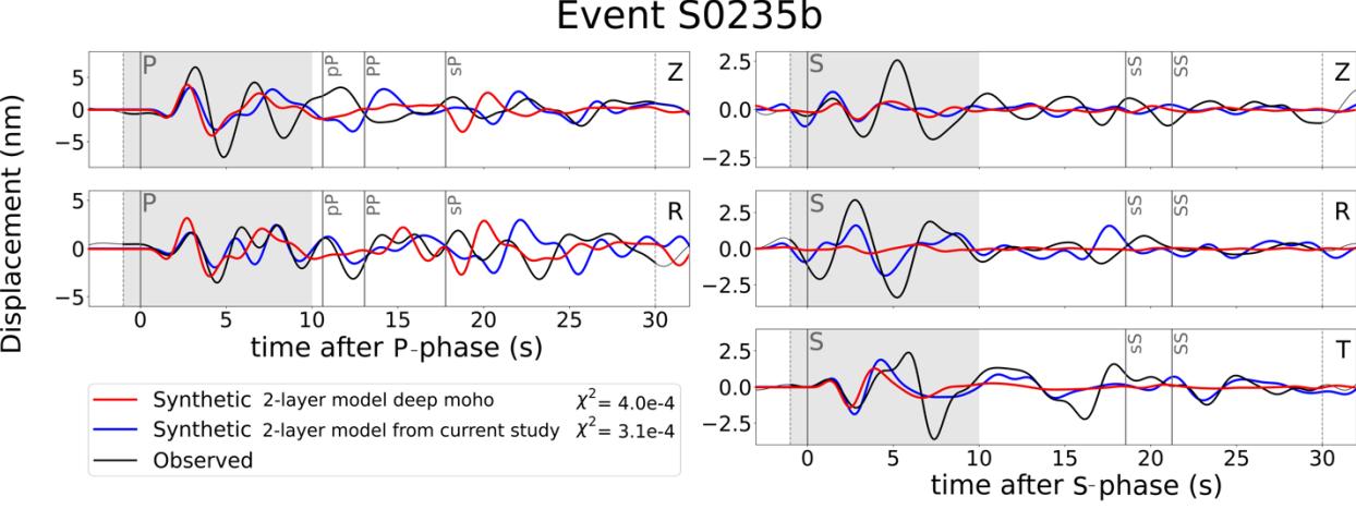 图4 不同速度模型的波形正演(Knapmeyer-Endrun et al., 2021)。两层速度模型,其中Moho深度 为80 km(红线) 和 24 km(蓝线)