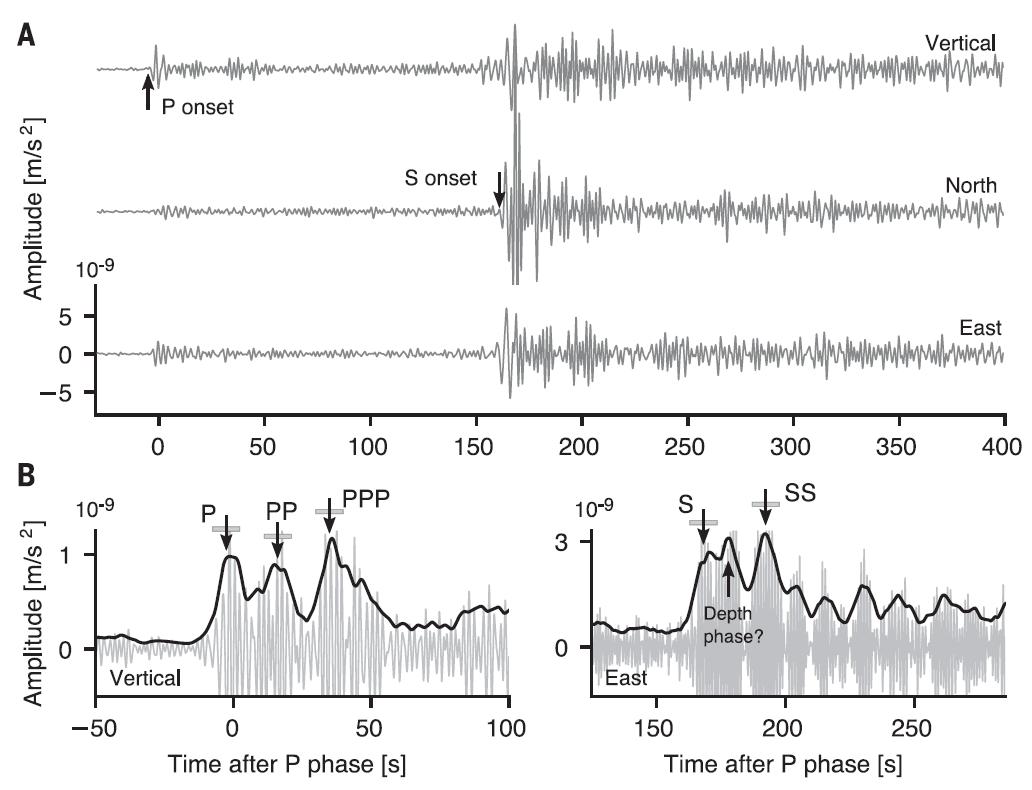 图1 火震仪记录到的火震事件(Khanet al., 2021)。(A)火震事件(S0235b)三分量宽带滤波波形记录(滤波频段:1.5-8 s);(B)能量包络线上可以看到P、PP、PPP、S、SS等多种震相