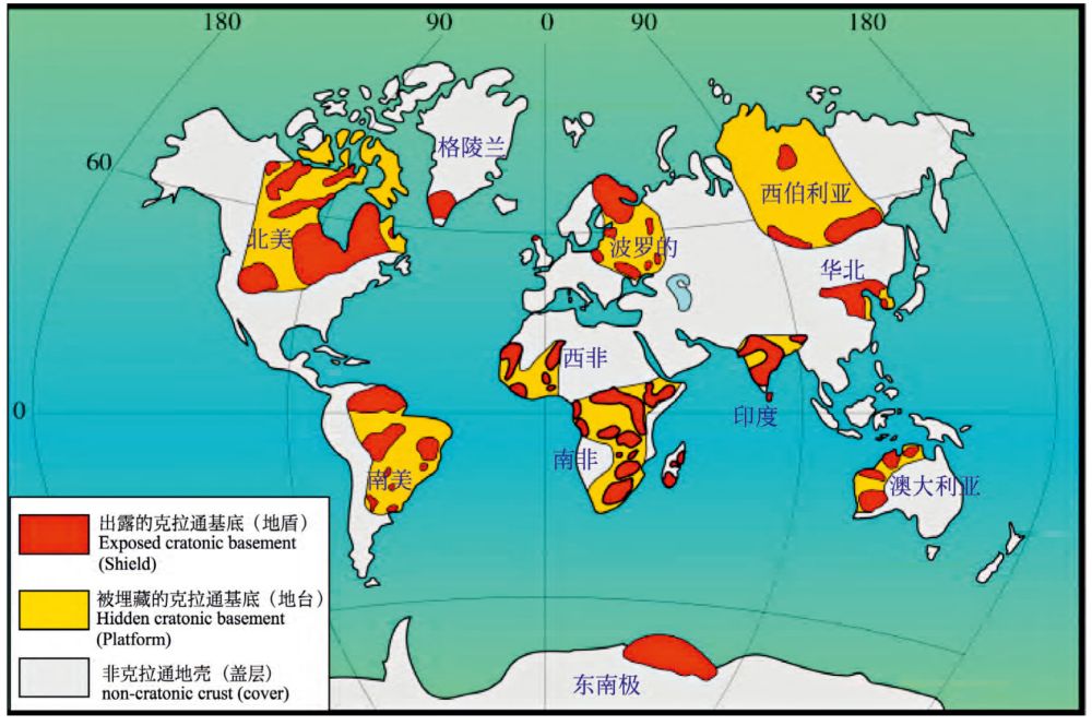图1展示了全球主要克拉通陆块的空间分布。古老的克拉通大陆长英质岩石除少量形成于冥古宙40亿年前的加拿大Acasta长英质片麻岩外,其余多数均主要形成于太古宙。有关北美、格陵兰、南非、澳大利亚等古老大陆太古宙岩石的同位素研究结果显示地球在冥古宙阶段可能已经形成一定规模的初始陆壳,称为原陆壳。由于晚期大冲击事件或者后来的板块构造的强烈改造,原陆壳物质在地球上很少得以保留。