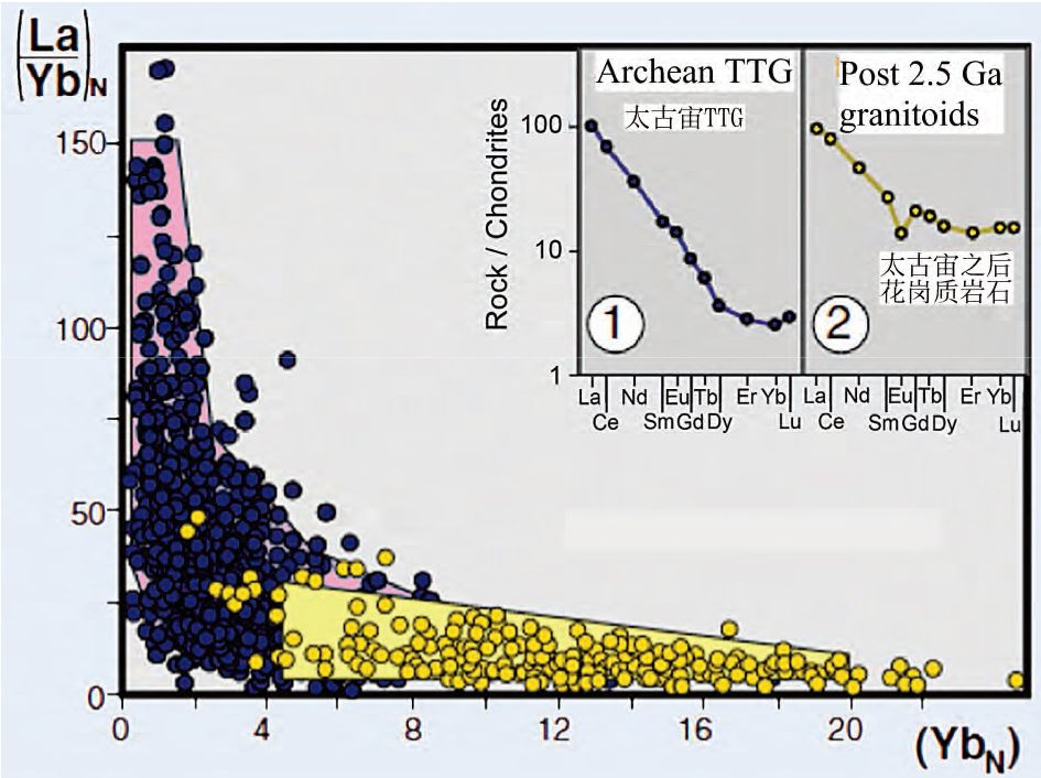 图2 太古宙TTG与太古宙之后花岗质岩石的La/Yb-Yb差异图