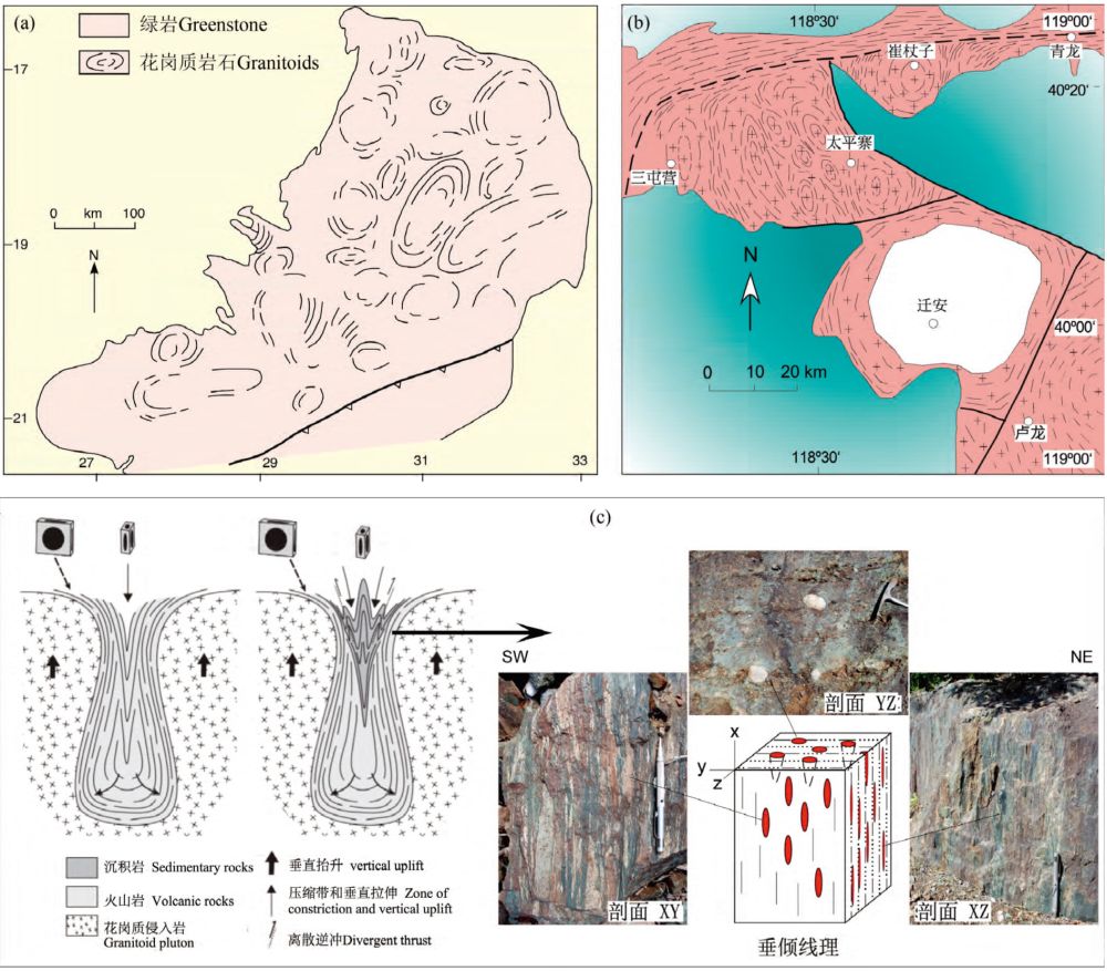 早期的陆壳内部构造样式常常以垂向构造运动的片麻岩穹窿(图3)为特征,表现为组成克拉通主体的TTG岩浆以底辟形式上涌形成不同规模的片麻岩穹窿构造(dome structure),同时周缘的相对密度较大的超基性、基性变质表壳岩沉降下凹形成向形或龙骨构造(keel structure)。这种构造样式在不同古老克拉通内部依然保留很好记录,在野外记录中则体现为,片麻岩穹窿与表壳岩接触边界往往以强烈垂向剪切拉伸为特征,表现为大量发育近竖直方向的拉伸线理或L型构造岩,反映垂向构造运动。这与显生宙反映水平运动为特征的板块构造体制所具有的大规模逆冲带、线性构造带、韧性剪切带、鞘褶皱、矿物拉伸线理、构造混杂岩带等构造样式具有明显差异。