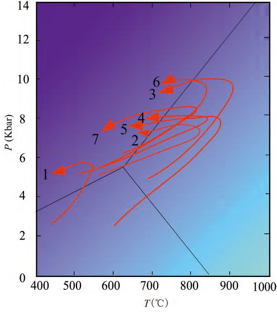 (6)多数太古宙克拉通陆块经历的太古宙变质作用以具有等压冷却(IBC)型逆时针P-T演化轨迹为特征,具有等温减压(ITD)顺时针P-T轨迹的太古宙变质岩石在一些克拉通上也有所报道。具有等温减压(ITD)顺时针P-T轨迹的变质作用一般被认为是发生在板块俯冲或相互碰撞的构造环境中。