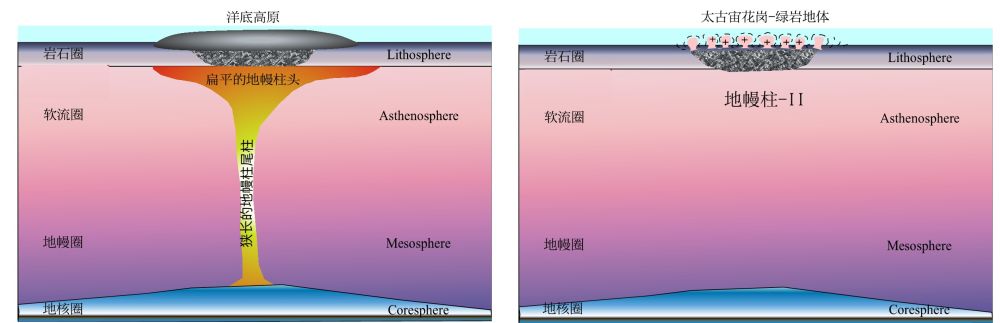 太古宙绿岩多为基性的拉斑玄武岩和超基性的科马提岩。科马提岩的形成温度一般在1600℃以上,远远高于拉斑玄武岩1200-1400℃的形成温度。Campbell et al.(1989) 曾提出太古宙绿岩带中科马提岩来自地幔柱尾柱通道的熔融产物,而玄武质岩石则是地幔柱巨大球状顶冠在岩石圈底部发生减压熔融后喷发地表所成。