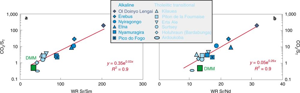图1 火山气体CO2/ST与全岩微量元素Sr/Sm、Sr/Nd比值之间的相关关系(Aiuppa et al., 2021)。由于Sr、Sm与Nd等微量元素具有相似的地幔地球化学行为(如相容性),因此在部分熔融、岩浆分异过程中,其比值基本不发生分异,可以代表岩浆源区的特征
