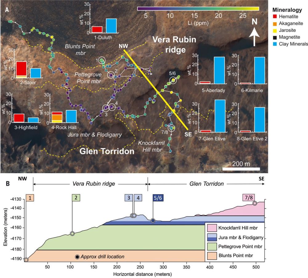 最近,好奇号火星车从Vera Rubin(VRR)山脊到Glen Torridon (GT),对盖尔陨坑35亿年前沉积在湖泊中的岩层进行了探测(图1A),NASA的Bristow等研究人员基于好奇号钻取的同一时期沉积在相似环境中的古湖泥岩的数据,发现距离<400 m以内的同沉积岩层的矿物学存在显著的空间差异。钻孔样品结果显示,东南部GT区域的粘土矿物主要为富含Fe3+的二八面体蒙脱石,部分样品含Fe2+的蛇纹石-滑石混层矿物(S-T),粘土矿物的含量为26-34 wt%, 而西北部VRR区域的粘土矿物含量约为5-13 wt%,显著低于GT区域;相反,VRR区域的铁氧化物和铁氢氧化物的含量可达9-16wt%,而在GT区域则小于2 wt%。也就是说,同一时间沉积的同一套地层中的矿物组成,尤其是粘土矿物含量存在显著的差异。