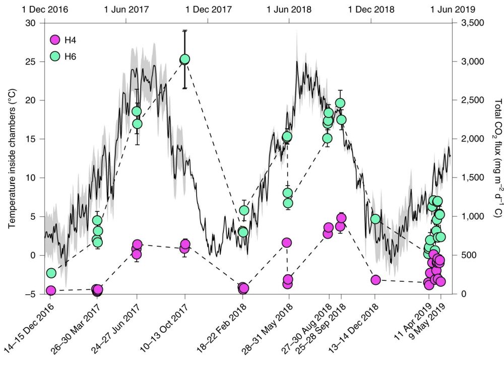 图1 在拉瓦尔集水区岩石空洞内测量的二氧化碳通量与温度(黑线)比较图(Soulet et al., 2021)