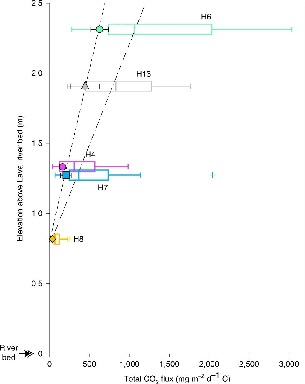 综上,二氧化碳通量的变化可以与降水、渗透和径流联系起来。事实上,作者观测到2017年十月中旬在经历了四个月的干旱期后,二氧化碳通量值达到最大。所有的钻孔对水文条件表现出了相似的反应,表明气体运动——氧气进入和二氧化碳释放受到水饱和度的控制。