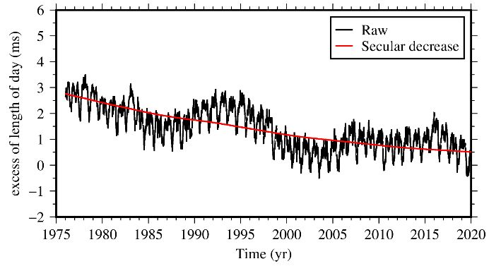 图1 日长观测时间序列。黑色曲线表示观测值,红色曲线表示长趋势。数据来源于IERS网站(国际地球自转服务)