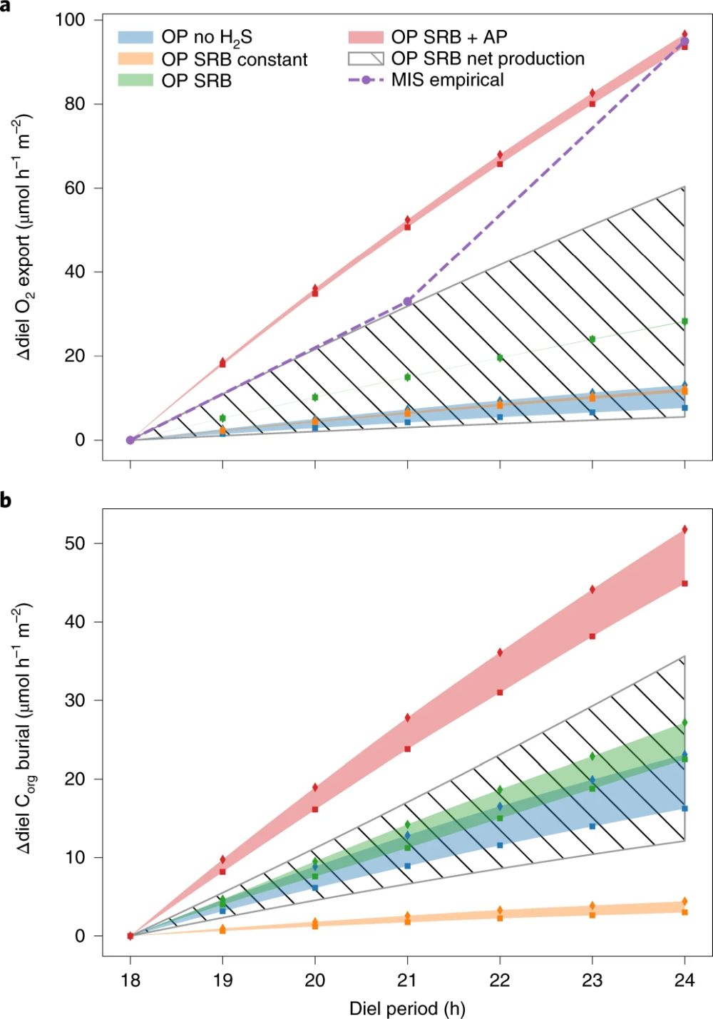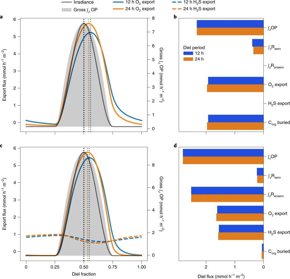 图2 白昼时长分别为12和24小时状态下总氧气(O2)产量,氧气(O2)和硫化氢(H2S)输出量,Corg 呼吸和埋藏昼夜均值时间演化模拟 (Klatt et al., 2021)。(a)在O2为25 μM (pO2= 0.1) 的水体下纯OP系统中总OP (∫z OP, 灰色)的深度积分值;(b)有机碳(Corg)埋藏随着白天时长而增加;(c)存在硫还原细菌厌氧呼吸情况下,总光合作用和厌氧呼吸生成的硫化物产量与该模拟中光照动力学无关,O2和H2S输出通量受白昼时长调节;(d)白昼时间越长,微生物席输出更多的 O2并储存更多的Corg