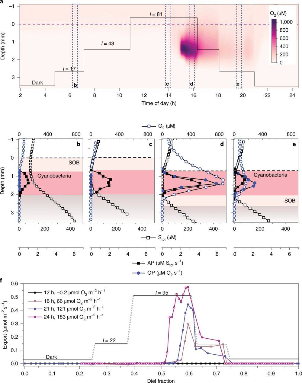 该研究团队进一步证明,相对于栖居者生产的总光合作用量的演化,底栖微生物的栖息地覆盖面积与白昼时长驱动的效应是最相关的(图3)。除此之外,作者还对类似于元古宙生活环境的现今蓝细菌微生物席进行了实测研究:通过微型传感器观测了光合作用和O2输出速率(图4),显示净O2产量与光照时长,即白昼时长呈正相关性。