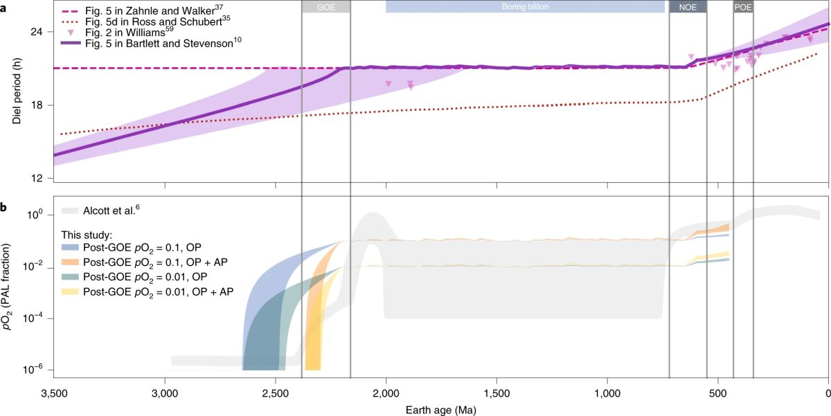 图5 白昼时长和大气增氧的关系 (Klatt et al., 2021)。(a)基于经验或者模拟重建的白昼时长的演化特征,其变化趋势与24-5.4亿年(GOE至NOE)期间大气增氧阶段趋势相对应;(b)全球大气pO2准稳定状态对于白昼时长驱动滨海微生物席和陆地有机碳埋藏通量的变化的响应关系