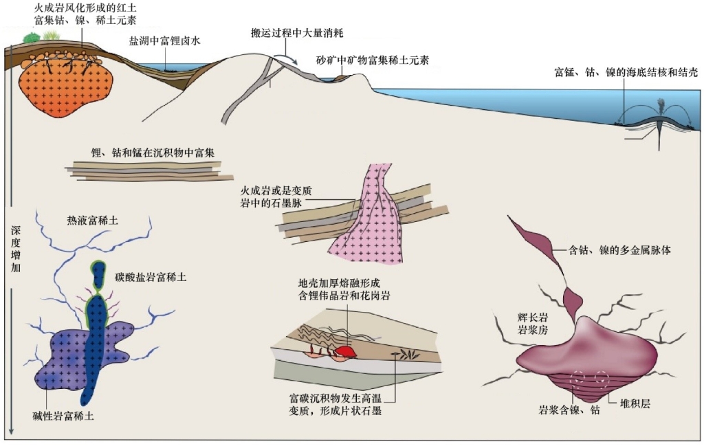 图1 稀土元素、锂、钴、镍、石墨和锰的主要地质矿床类型概述(Pell et al., 2021)。风化矿床、矿砂和盐水形成于地表;结核和结壳形成于洋中脊附近和海底热液喷口;沉积物和火山沉积物形成于地壳浅部(例如:深度小于4公里);地表4公里以下有火成岩和变质岩