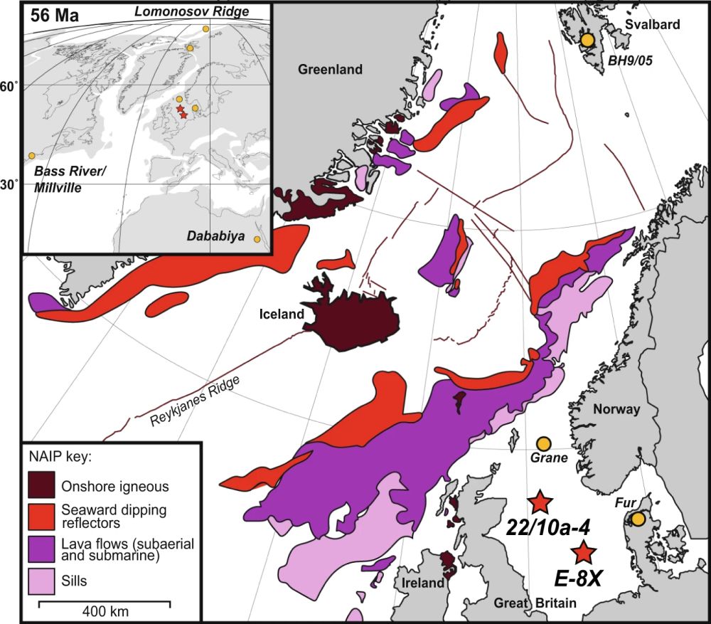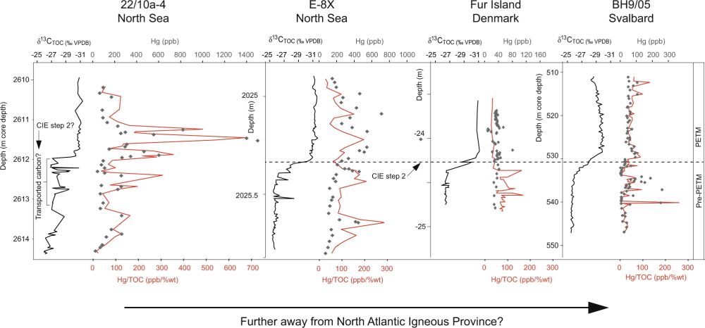 大规模的火山活动会释放大量的Hg,这些火山来源的Hg在年际尺度以有机物吸附的方式被保存在沉积物中。因此,通过测定沉积物中Hg的含量,可以揭示地质历史时期的火山活动强度。近期,英国埃克塞特大学Kender教授及合作者对北海(North Sea)盆地(图1)两个钻孔岩心(22/10a-4和E-8X)进行高分辨率的碳同位素组成和Hg含量分析,详细梳理了PETM时期火山活动同碳释放之间的耦合关系,相关成果发表于Nature Communication。 Kender等人发现,经有机碳(TOC)标准化后的Hg含量(Hg/TOC)呈现出两个显著特征(图2):(1)碳同位素负漂开始阶段,Hg/TOC值剧烈波动,整体上显著高于事件发生前的背景值;(2)距离北大西洋火成岩省越远,沉积物中Hg/TOC值波动幅度和频率逐渐递减。这些观测事实证明沉积物中Hg的异常富集主要来源于北大西洋火山岩省的剧烈活动,且火山喷发发生在海底。