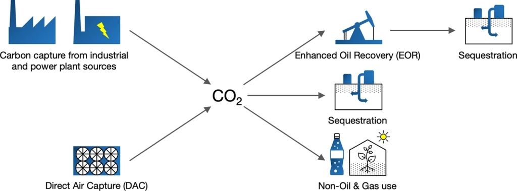 图1 CO2捕获、利用与封存(Meckling and Biber, 2021)。CO2捕获有两种方式:对电厂或工厂排放的CO2进行捕获(CCS)和从空气中直接捕获(DAC)。图中,“Sequestration”是指将CO2注入地下深部岩层进行长期封存;“Non-Oil & Gas use”包括化学加工、饮料添加和温室种植