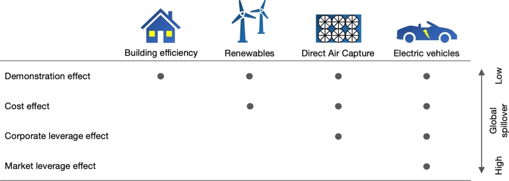 图2 建筑节能、可再生能源、DAC与电动汽车技术转型的全球扩散效应(Meckling and Biber, 2021)。在所有低碳技术转型中,先行者都可以对跟随者产生示范作用(demonstration effects),通常还能降低跟随者的技术成本(cost effects);在某些情况下,先行者还可以通过企业杠杆(corporate leverage effects)和市场杠杆(market leverage effects)带动跟随者参与新技术的全球扩散