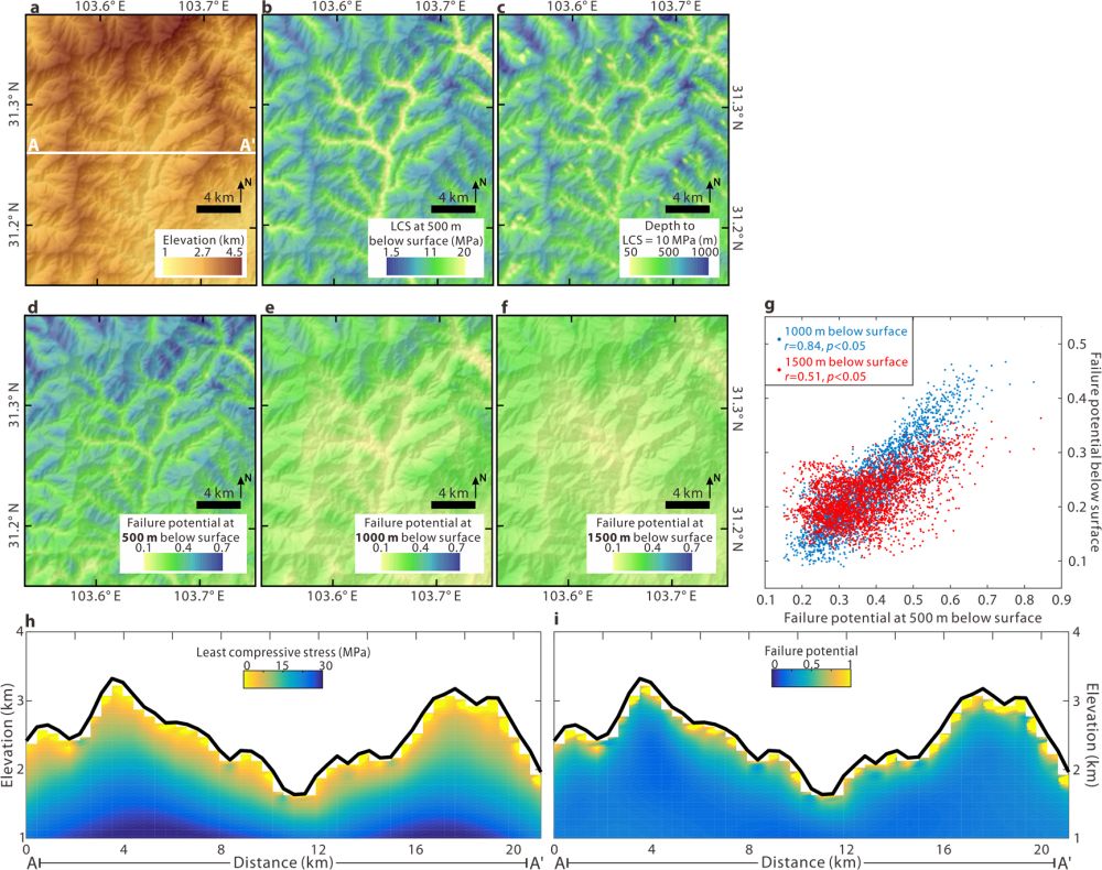 理论和观测研究表明,由于构造和重力场对地形扰动,地下基岩的结构面分布存在显著差异。这些研究表明,地形应力场随构造应力的大小和方向、重力应力和地形形状的变化而变化,从而影响基岩地下结构面发育的水平和垂直范围。这些张开结构面影响着地质体的各种物理和化学风化过程,并控制了风化基岩的底部边界。因此,这些受到地形应力控制的张开结构面的范围对基岩滑坡的发生提供约束,并控制基岩的岩土体强度,从而限制基岩滑坡的规模。然而,由于在区域空间尺度上表征这些结构面的难度,对以上的相关研究仍然是空白。