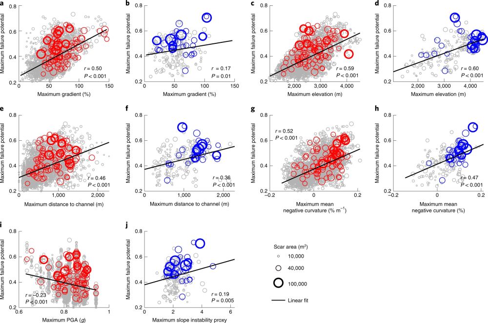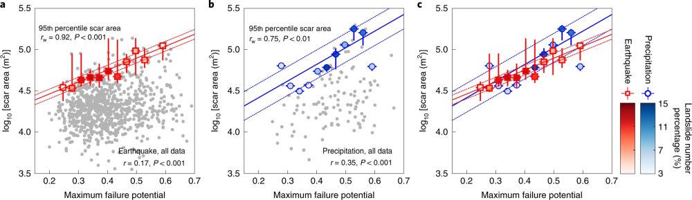 (1)在地震和降水诱发的滑坡中,基岩滑坡面积上限与FP500m (FPmax)的最大值存在较强的正相关关系;这种相关性优于弱相关性,但具有统计学意义,FP500m的平均值和最大值与所有基岩滑坡的物源区呈正相关(r = 0.17-0.35, P < 0.001)(图3,灰色圈)。FPmax值与张开结构面的最大范围或滑坡内产生剪切断裂的最高可能性相对应。为了确定给定FPmax范围内的滑坡面积上限,作者首先从滑坡面积的90、95和100百分位数中测量岩质滑坡面积的前10%。作者发现FPmax与滑坡面积和宽度的第95百分位有很强的正相关(r = 0.75-0.92,P < 0.01)(图4)。这些强相关性对定义岩质滑坡的区域选择和环境应力条件的估计不确定性都不敏感。等压力指标LCS500m的最小值和最大值的D10MPa也显著表现与滑坡面积的第95百分位的相关性。虽然作者在此分析中关注的是前10%,但作者发现, FPmax与岩质滑坡规模的上20%之间也有良好的相关性。这意味着,张开结构main的范围为大型岩质滑坡规模的上限提供了一个强有力的预测指标。