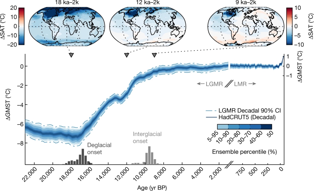 Osman M B, Tierney J E, Zhu J, et al. Globally resolved surface temperatures since the Last Glacial Maximum[J]. Nature, 2021, 599: 239-244.(原文链接)