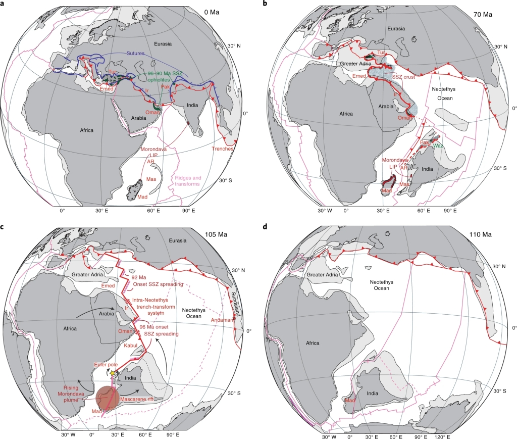 为了找到导致这一俯冲的触发因素,作者接下来进行了新特提斯洋及其周围大陆的板块运动学重建(图1)。结果显示:105 Ma新特提斯洋俯冲带内非洲和印度为相邻板块,非洲板块大部分被山脊包围,在地中海地区有一个复杂的俯冲板块边界。印度板块南部和东部被山脊转换系统包围,北部被俯冲包围。阿拉伯-大亚得里亚和欧亚大陆之间的新特提斯洋岩石圈继续地向北倾斜俯冲,该俯冲带自侏罗纪以来一直存在于欧亚大陆南部边缘(图1b、图1c)。海洋地球物理约束显示,在马斯卡林盆地海洋扩张开始前约83 Ma的裂谷作用期间,印度相对于非洲围绕西印度洋欧拉极逆时针旋转约4°(图1c),这与跨越新特提斯的数百公里的东西向会聚有关(图1d)。白垩纪内新特提斯板块边界可能已经收敛到西印度洋的Amirante海脊,并从该处变为伸展,并在马斯卡林盆地中形成了一条裂谷,后来形成了一条扩张海脊,印度与马达加斯加在该海脊处分离(图1b)。