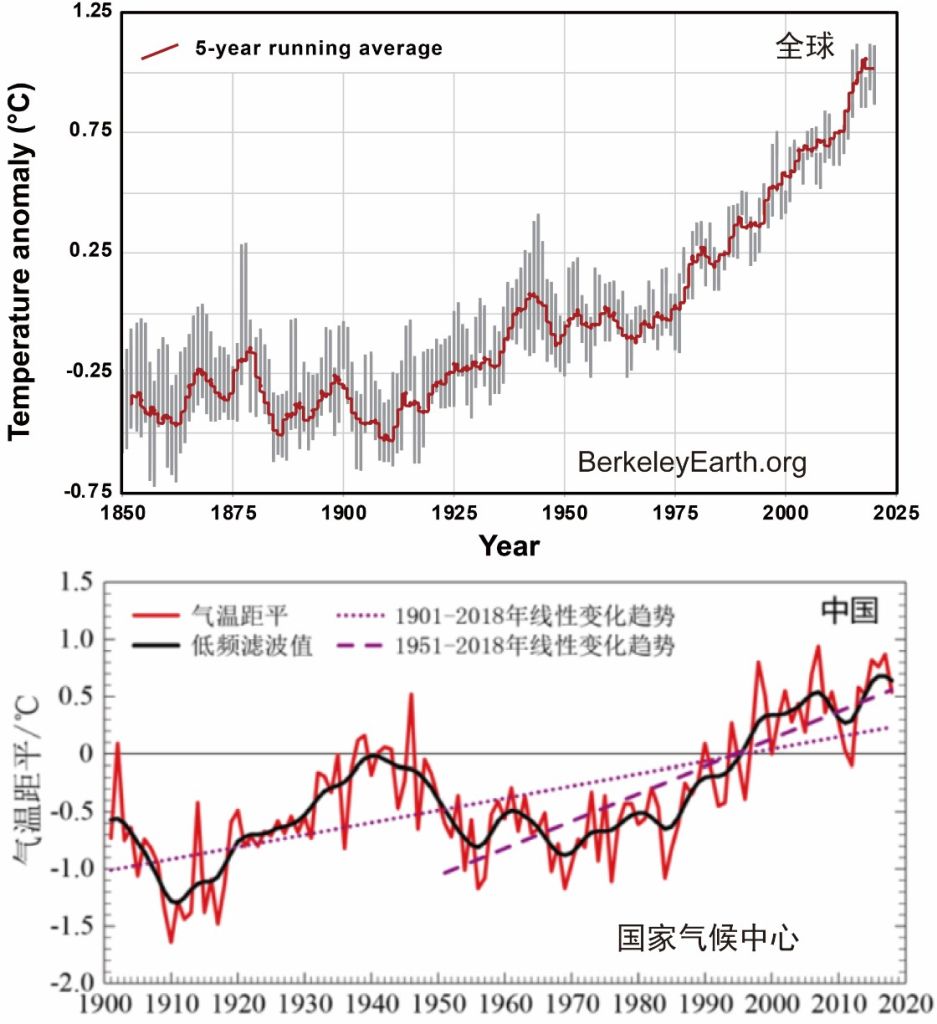 目前有众多证据都表明全球气温正在升高,并且对我们的生存环境产生了很多影响。包括冰川消融、两极冰盖范围缩小、海平面上升、极端天气事件增加、山火更加频繁、物种灭绝速度增加等等。2021年有两份关于全球气候变化的报告于 8 月出版。其中一份是联合国政府间气候变化专门委员会(IPCC)的报告。另一份是中国国家气候中心的报告,主要记录的是中国的气候数据。第一张图展示的是全球1850年以来的气温变化,在1910年之前,虽然全球气温有升有降,但总体保持平稳,在这之后全球气温整体呈现上升趋势(图1a)。第二张图是中国1900年以来的气温变化,我们看到了同样的记录(图1b)。因此,不论是全球记录还是区域记录,它们都显示出同样的特征,即在上个世纪中全球气温升高了 1~1.5℃。