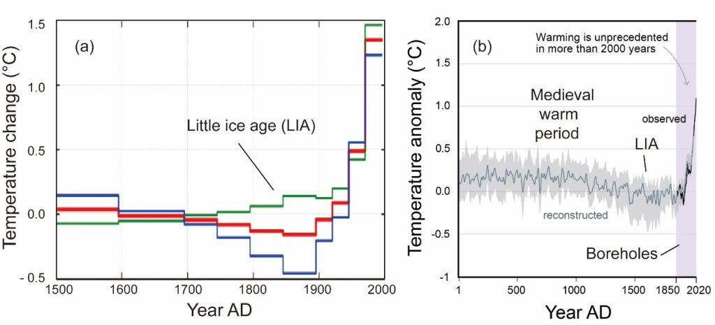 图2 (a)钻孔的温度剖面反演的地表温度变化(修改自Jaume-Santero et al., 2016);(b)树轮记录的过去近2000年的温度变化(修改自IPCC 2021年度报告)