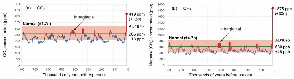 通过计算如果要达到现今二氧化碳浓度的概率是1/(5×1032),甲烷浓度的概率是1/(1×10197)。这就好比你和你的朋友都随机选中了银河系中的同一颗星星,抑或是地球上的同一粒沙子。这样的可能性明显非常非常小。毫无疑问,人类排放的温室气体正在将地球推向异常气候状态,至少这种状态在80万年的尺度上是异常的。