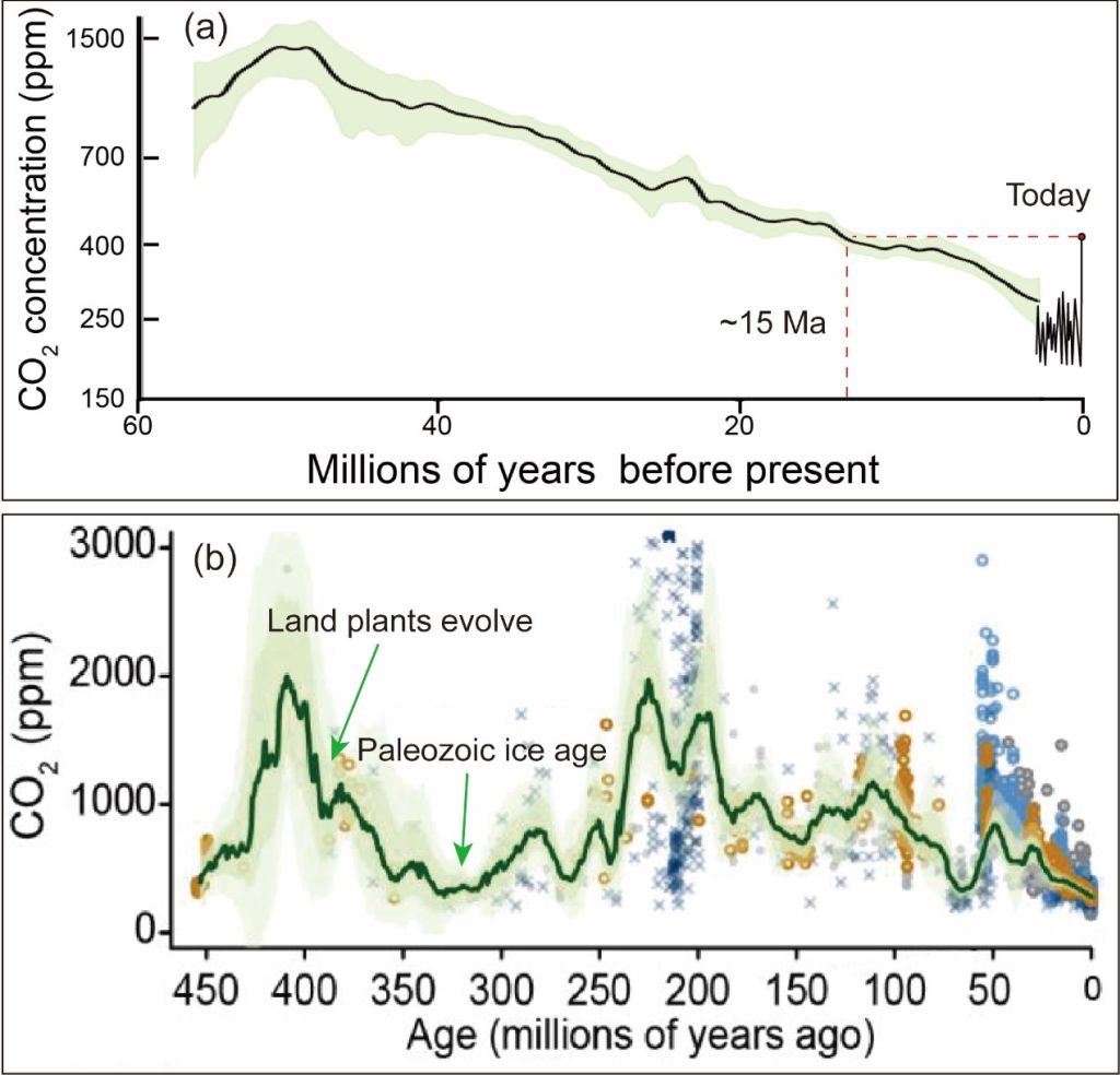 图5 IPCC 2021年重建的早古新世(~60 Ma, a)和晚奥陶世(~450 Ma, b)以来全球大气中二氧化碳浓度变化特征(数据来自于Paleo-CO2.org)