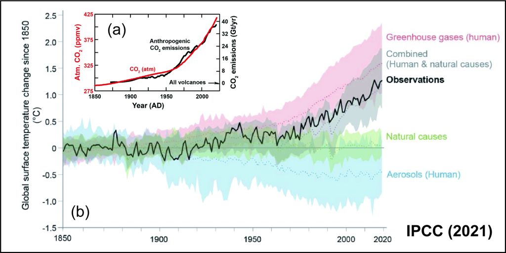图6 (a)1850年以来大气中二氧化碳浓度变化与人类活动释放的二氧化碳通量变化情况; (b)1850年以来人类活动引起的温度变化与实际观测结果之间的关系